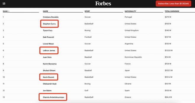 据福布斯的测算,在2025年全球运动员收入榜单中,字母哥总收入1.025亿美元,排在第13位。在篮球运动员中,他高居第四,仅次于库里、詹姆斯、杜兰特。